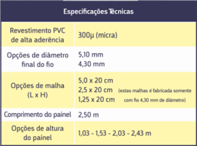 É fabricado com arame de aço galvanizado por imersão a quente, eletrossoldado e revestido com 300u (micra) de PVC de alta aderência. Além de ser extremamente resistente e oferecer máxima proteção contra a corrosão inclusive em áreas litorâneas, seu design diferenciado proporciona maior visibilidade das áreas interna e externa, perfeito acabamento, segurança e visual harmonioso. É indicado para diversos tipos de cercamentos, tanto em áreas residenciais urbanas, como para rurais ou litorâneas, áreas comerciais ou industriais, etc.