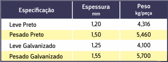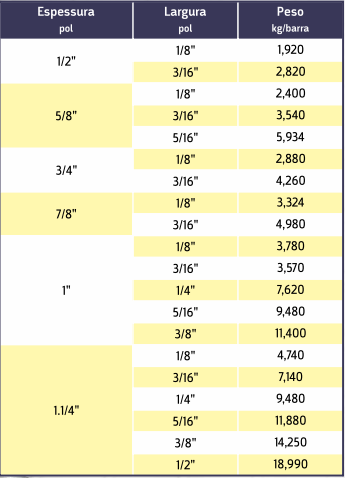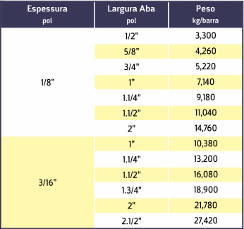 Normalmente fornecida de acordo com a Norma ASTM A 36. Sob consulta, pode também ser fornecida segundo as Normas ASTM A 572, ASTM A 588 (resistente SAE 5160 (aço para mola), SAE 1045 ou SAE 1020 à corrosão atmosférica) |