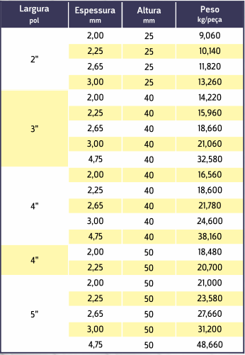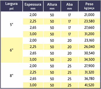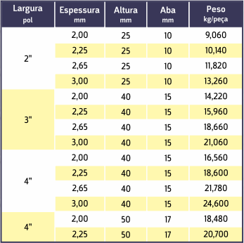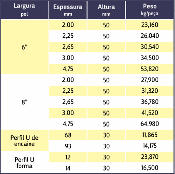A redução de peso das estruturas obtidas com a aplicação do Perfil U pode muitas vezes significar o aumento de produtividade e a redução dos custos necessários em seu projeto. Atende à Norma ASTM A 36. Sob consulta, pode também ser forneceida segundo a Norma ASTM A 588 ( resistente À corrosão atmosférica ). |